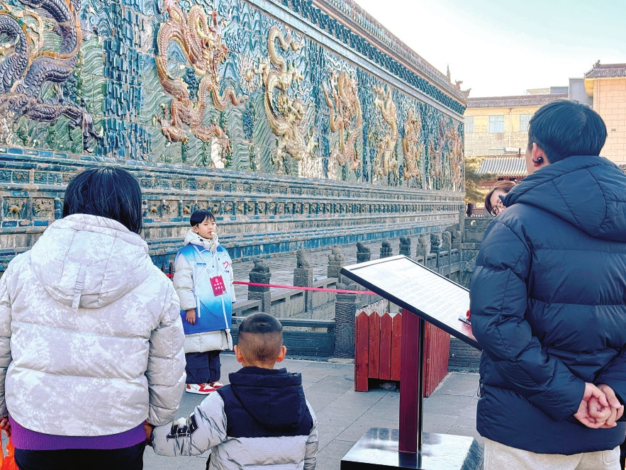 “大家请看,这块九龙壁是明代洪武年间的遗存,是中国现存三座九龙壁中,建造年代最早、体量最大的一座……”九龙壁前,8岁的小讲解员杨谨泽声情并茂地解说,游客们逐渐围拢过来。