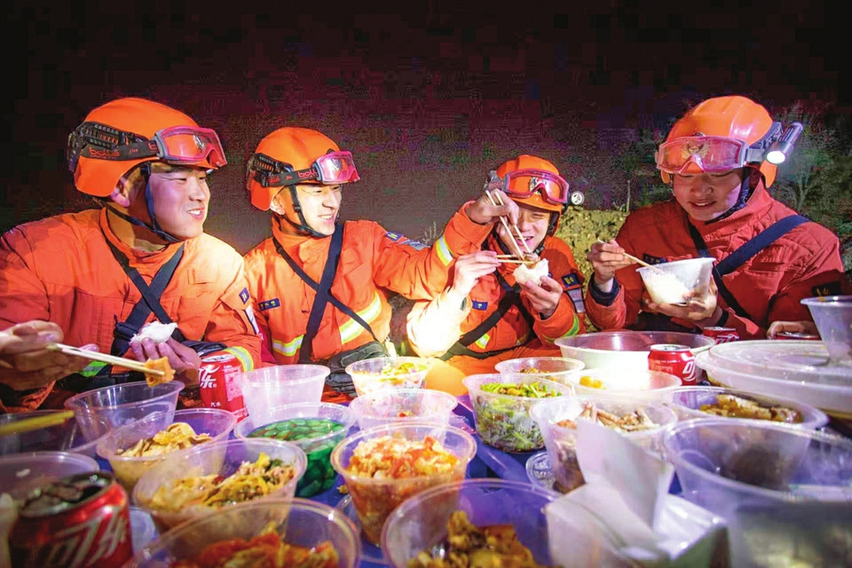 打开保温箱,热气扑面而来:红烧鲤鱼油润鲜亮、香气扑鼻,手工水饺饱满圆润、透着麦香,蒜薹炒肉色泽清爽……这顿晚餐,成了寒夜里珍贵的年味。没有餐桌椅凳,保温箱就成了临时“团圆桌”。消防员们或站或蹲,捧着热气腾腾的餐盒,大快朵颐、笑语朗朗,呵出的白气在寒灯下飘散。