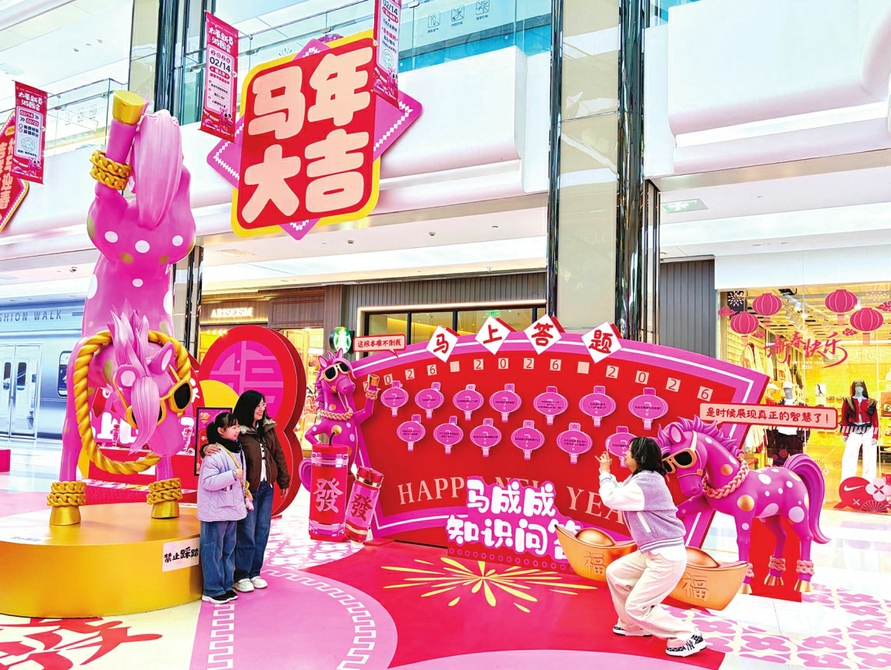 2月19日,省城小店区一大型商业综合体内布置的新春景观吸引消费者合影留念。