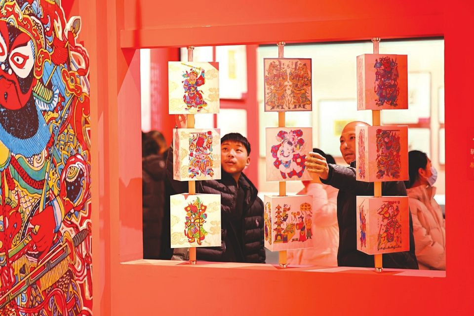 图③2月22日,市民在晋中博物馆民俗版画展厅,转动印有门神、吉祥娃娃等传统年画图案的互动魔方,近距离感受非遗艺术魅力。