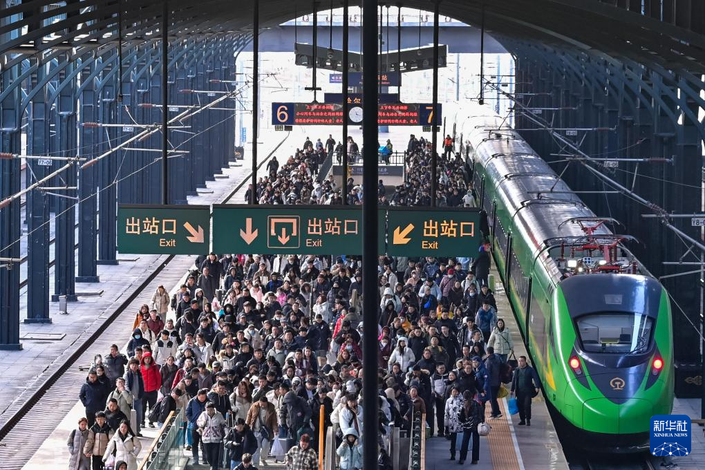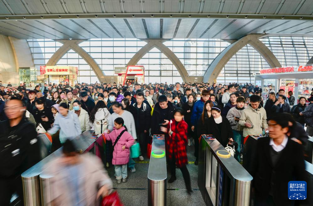 2月23日,旅客在哈尔滨火车站有序出站。