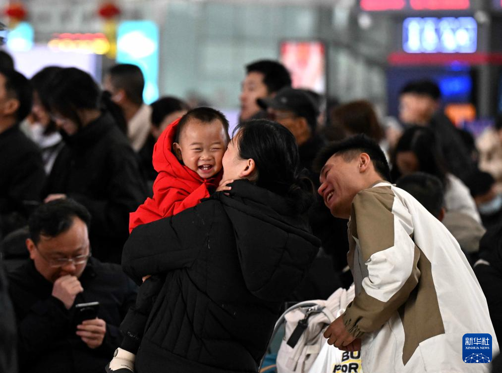 2月23日,一名小旅客和家人在河北石家庄火车站候车大厅候车。