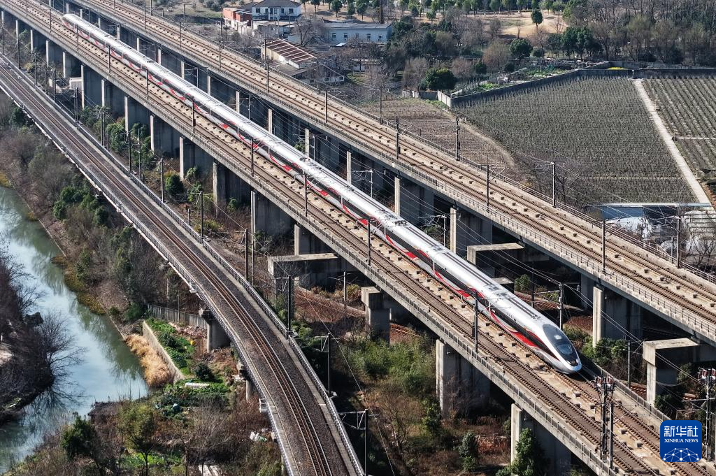 2月23日,列车在杭州境内行驶(无人机照片)。