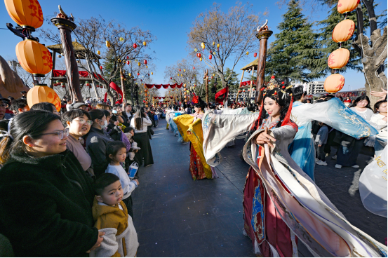 在太原古县城,最富创意的“幻境·赛博狂想电音庙会”震撼上演。巨型机甲关公巡游开道,电音与传统国乐混搭,刘备、关羽、张飞化身“电音主理人”,带领游客嗨翻古城夜场。一位本地市民王女士抱着孩子站在人群中,孩子目不转睛地盯着巡游的机甲马。“孩子刚才一直喊‘妈妈快看,马会动!’这种传统和科技结合的方式特别好,既保留了年味,又让孩子觉得新鲜。我觉得这就是我们这代人心里的年味——有记忆里的烟火气,也有现在的科技感。”正月初一单日客流突破12万人次,正月初四更创下16万人次的开城历史新高。景区实行免预约、免费入城政策,除城墙灯展等少数项目外,城内所有表演、互动均向公众开放,极大激发了游客出游热情。
