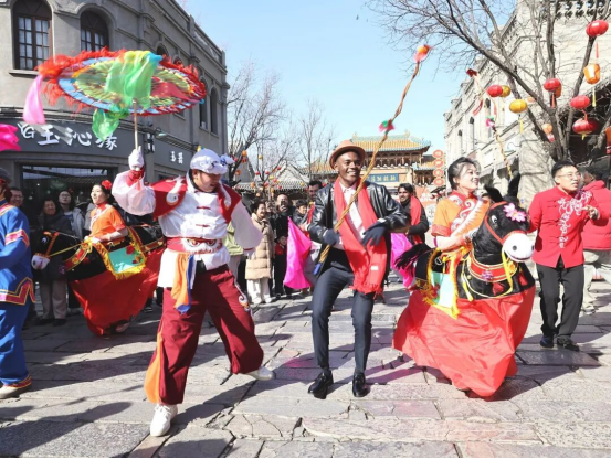▲忻州古城内外国游客和表演者互动(来源:山西国际传播中心)