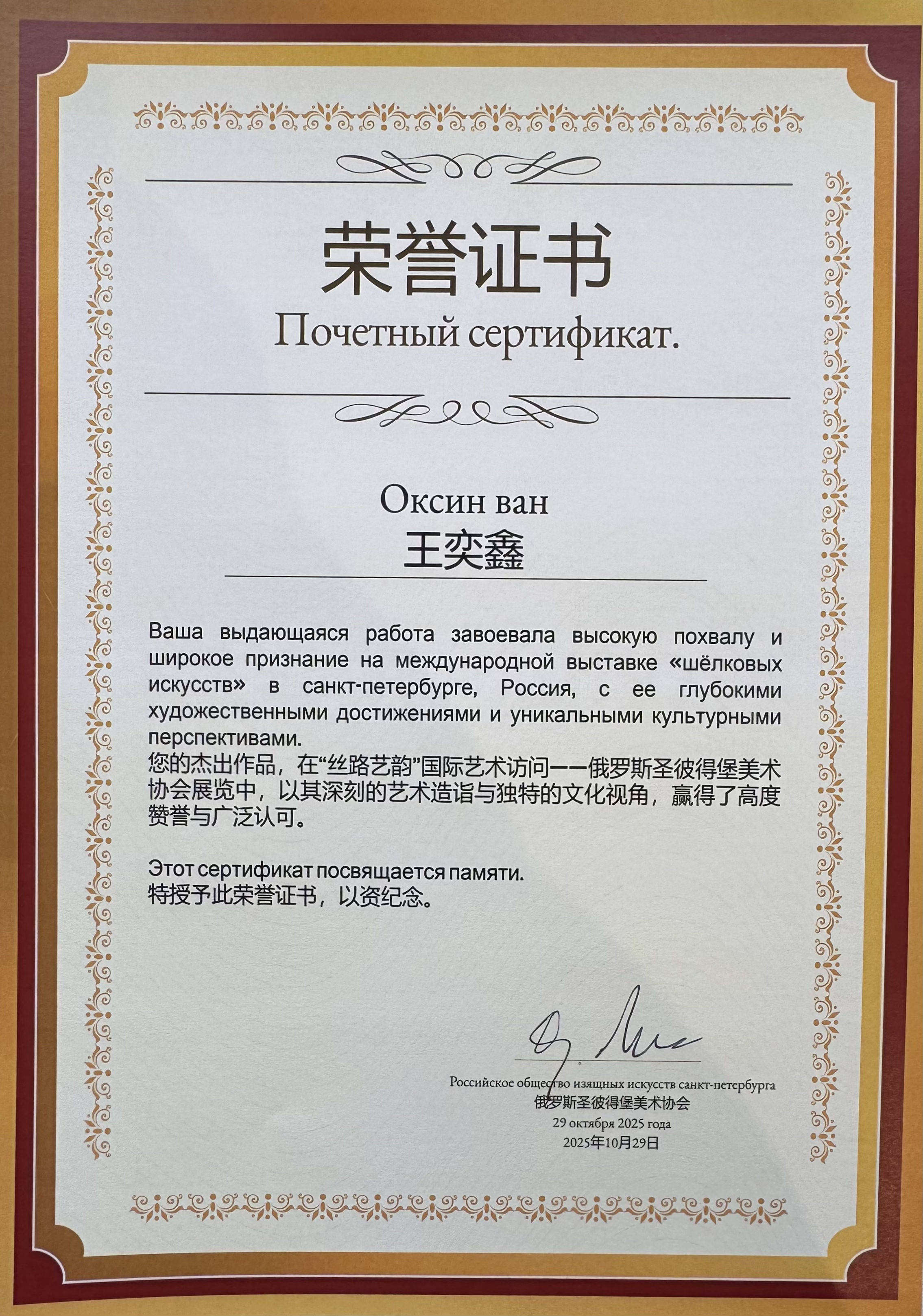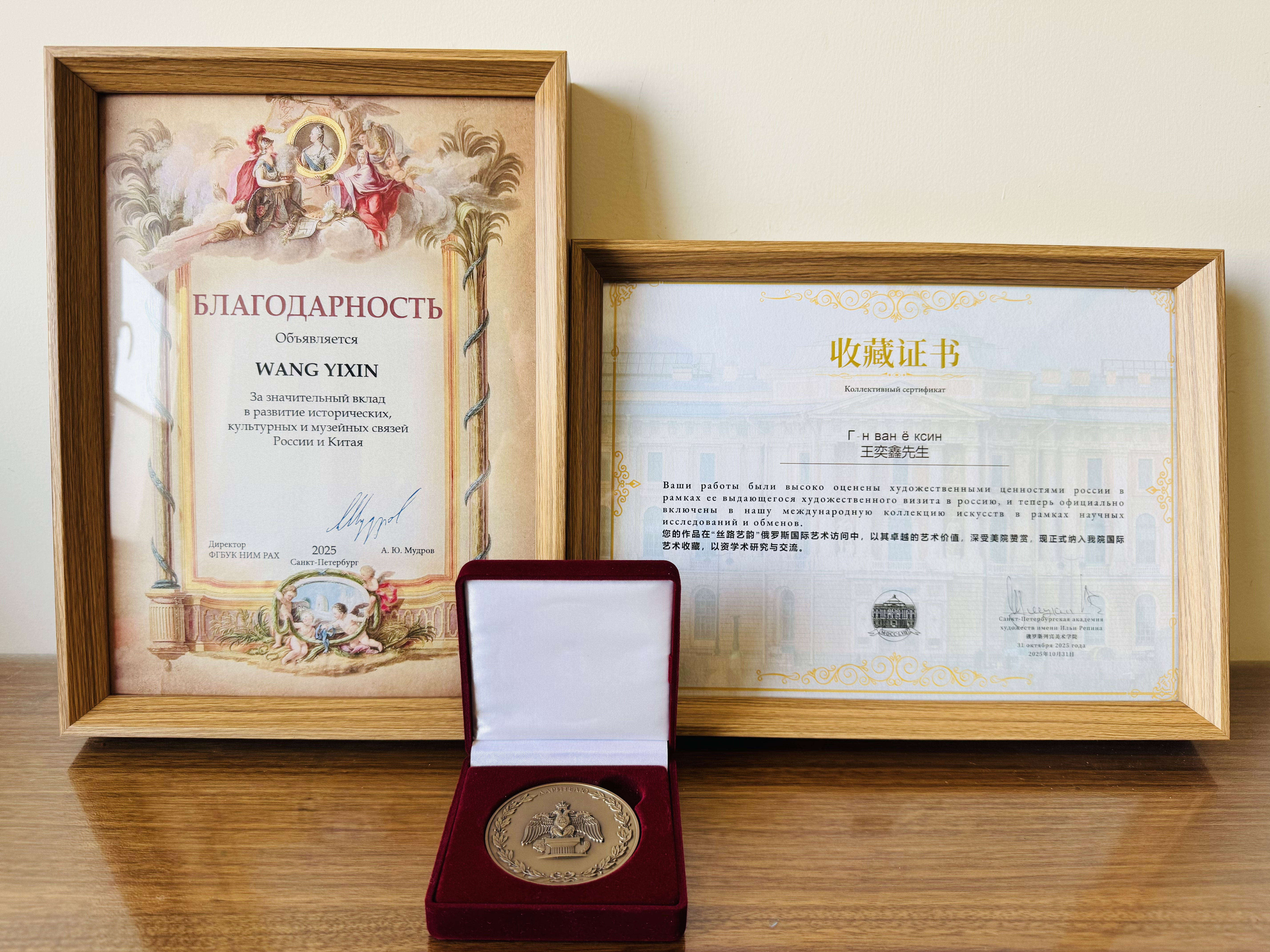 为表彰王奕鑫对中俄两国历史、文化及博物馆发展所做出的重要贡献,列宾美术学院的主管单位、俄罗斯艺术领域的最高学术权威机构俄罗斯艺术科学院特向王奕鑫颁发了感谢状及荣誉奖章。