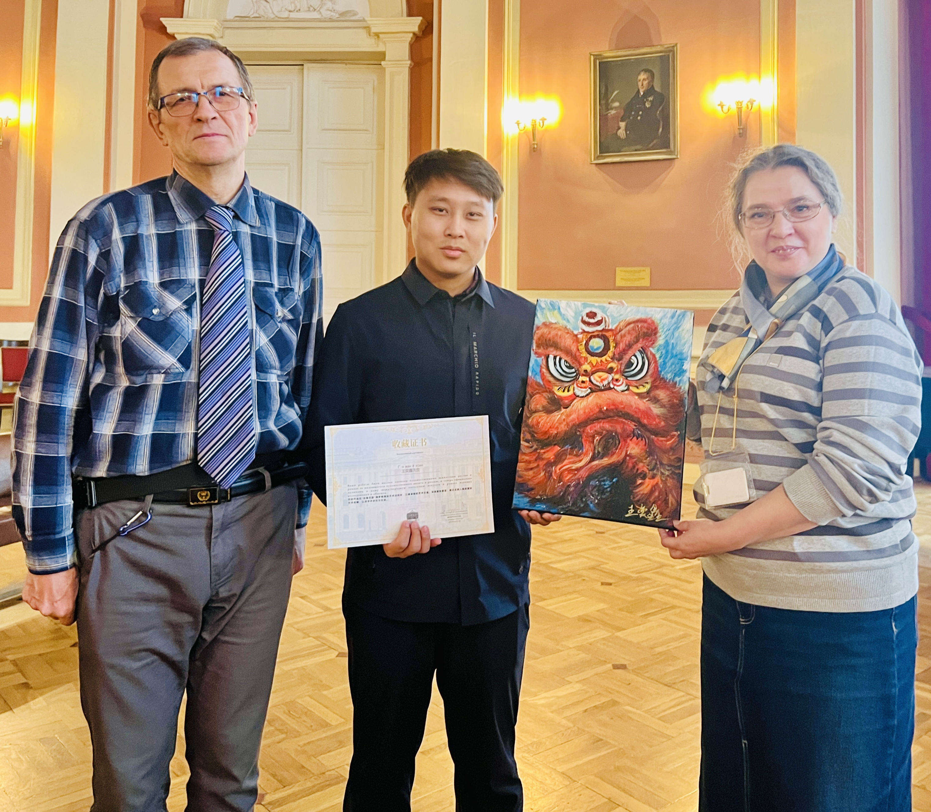 访问期间,王奕鑫创作的标志性油画作品《醒狮》被世界四大美术学院之一的俄罗斯列宾美术学院正式收藏,列宾美术学院校方领导、博物馆馆长等嘉宾悉数出席收藏仪式,学院特别定制并颁发了中俄双语收藏证书,以最正式的礼仪彰显对该作品艺术价值与文化内涵的高度认可。