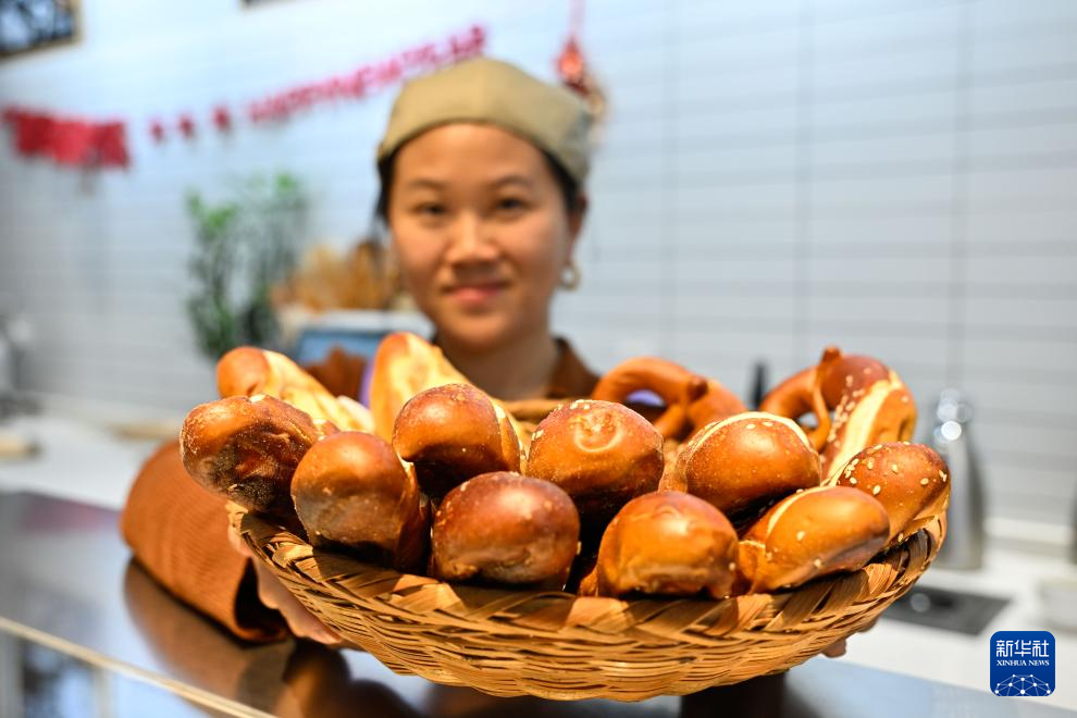 2026年2月24日,在太仓罗腾堡风情街,布鲁特德国面包房的服务员展示德国面包。