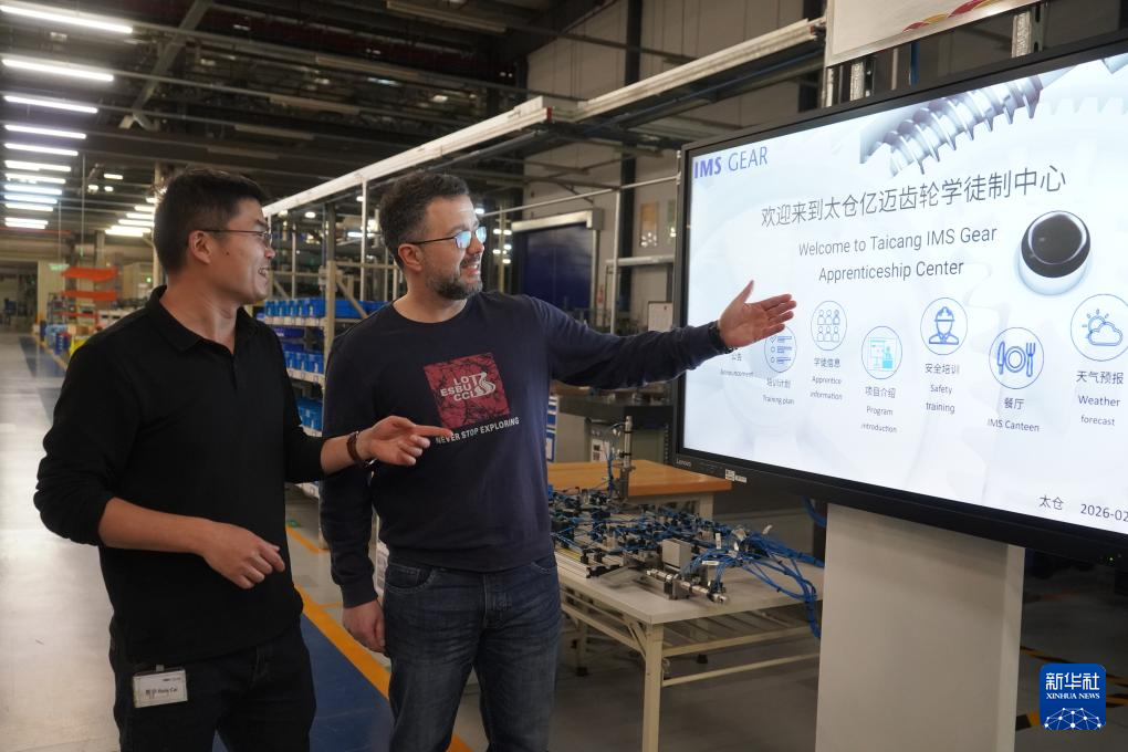 2026年2月24日,培训师托马斯(右)在亿迈齿轮(太仓)有限公司讲解双元制培训。