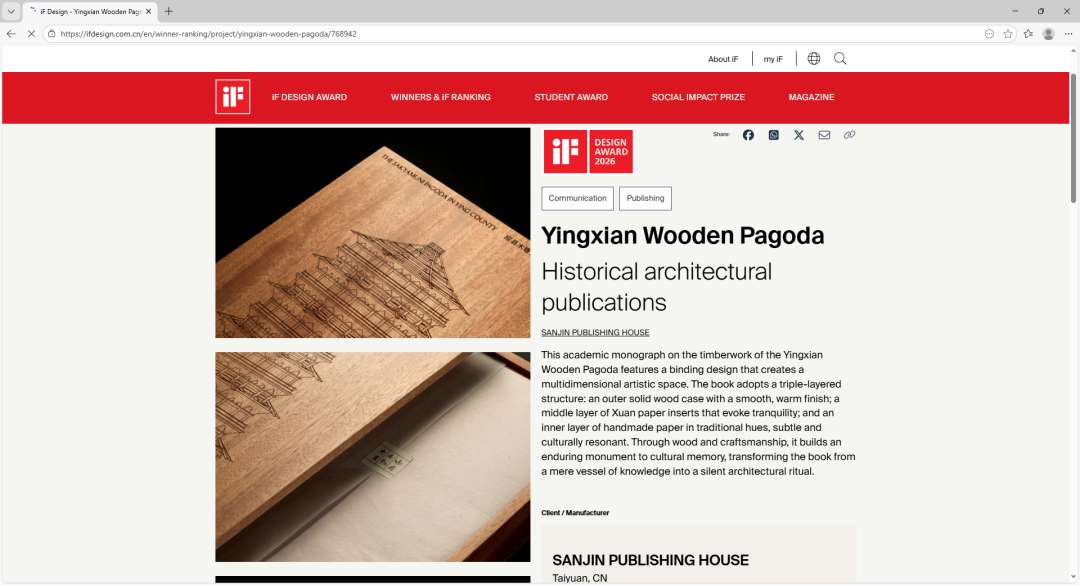 山西新闻网讯(记者 张晨阳)近日,2026年德国iF设计奖名单揭晓,“应县木塔大木作研究”系列丛书获奖。该书由乔云飞、刘畅主编,清华大学团队执笔,三晋出版社出版,是全球25件获奖出版作品之一,让中国古建研究与传统装帧美学惊艳国际。