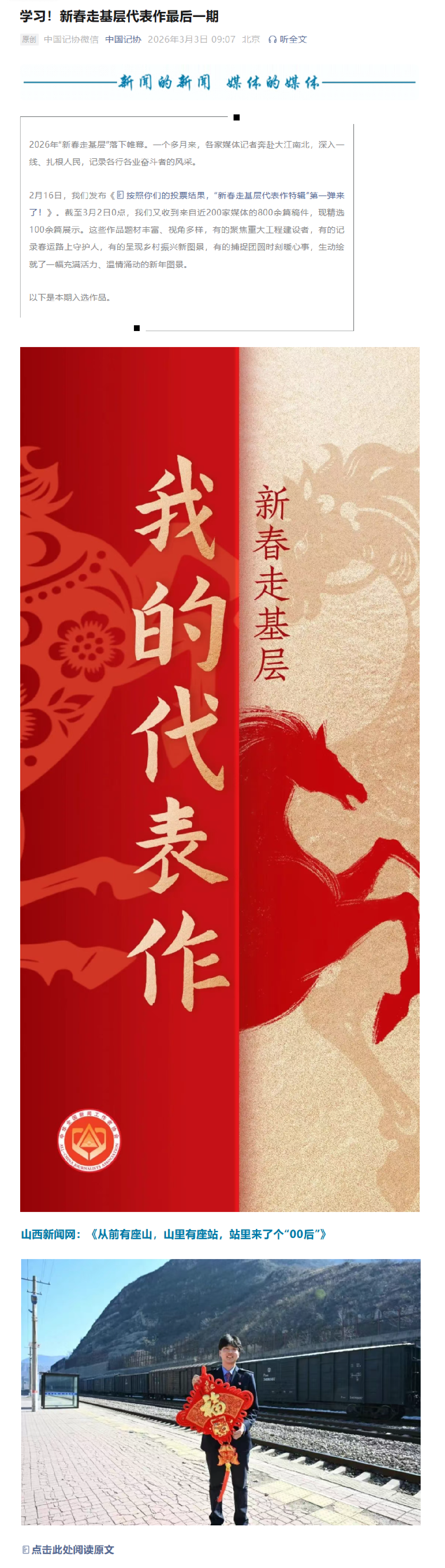 山西新闻网讯(记者 王翘楚)3月3日,中国记协发布2026年“新春走基层代表作”最后一期推荐名单,山西新闻网原创融媒体作品《从前有座山,山里有座站,站里来了个“00后”》成功入选。