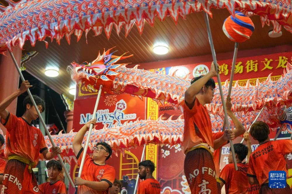 3月3日,表演者在马来西亚马六甲市鸡场街表演舞龙。