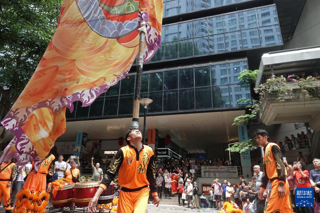 3月3日,在新加坡一商场外进行的元宵节庆祝活动上,演员表演耍大旗。