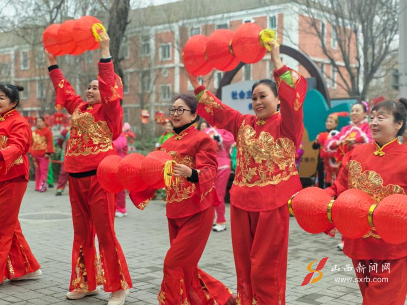 3月3日上午时分,太原市尖草坪区朝阳社区街道旁已经聚满了人。彩绸翻飞,锣鼓喧天,秧歌队的大妈们踩着鼓点扭得正欢,脸上洋溢的笑容无比灿烂。