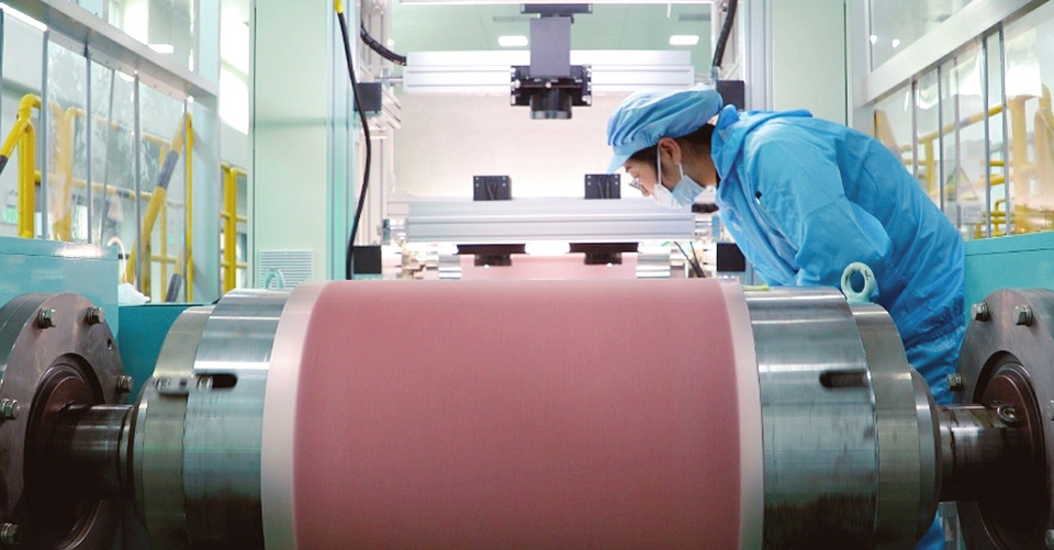 运城山西北铜新材料科技有限公司工作人员正在检查压延铜箔表面质量。本报通讯员摄