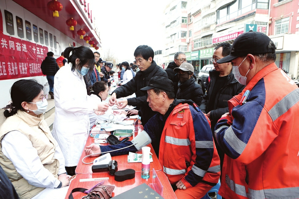 图①:3月5日,晋城市城区凤鸣社区联合辖区驻地单位开展学雷锋系列活动。活动现场,志愿者们为居民提供了理发、血糖检测、眼部检查等服务。