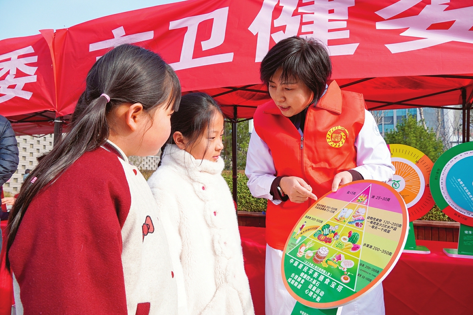 图③:3月5日,临汾市2026年“3·5”学雷锋纪念日主题活动暨“爱临汾·赢未来”志愿服务系列活动在平阳广场启动。图为志愿者正在科普健康饮食知识。