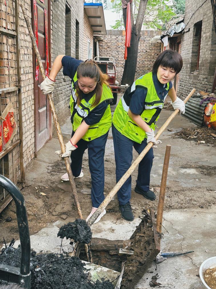 2025年7月,王润梅(右)和同事在清掏下水井。(受访者供图)