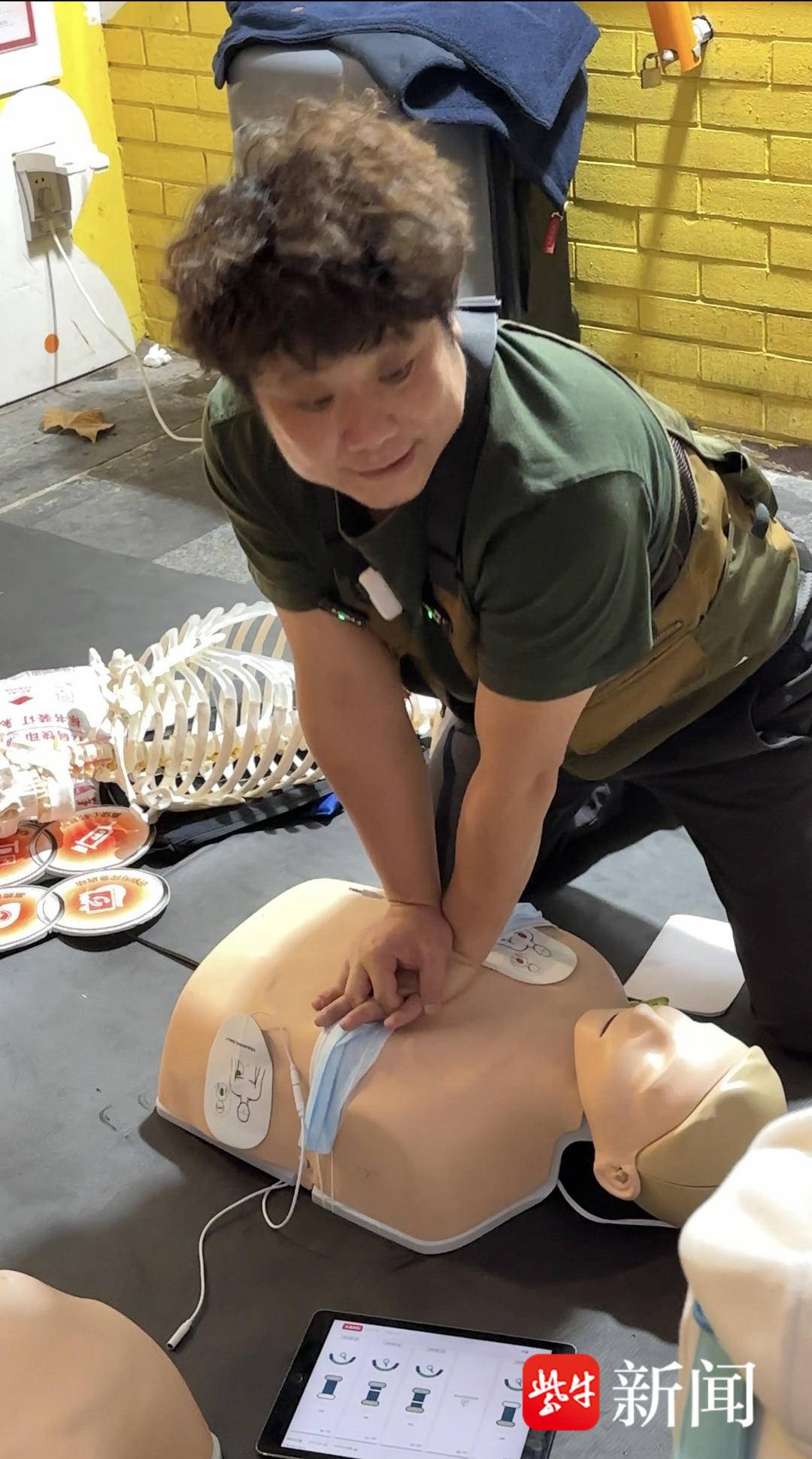 一排模拟人教具,一台AED训练机,就摆设在路边。路过的行人不用预约,随机组成一组,俯身跪在教具前,一起进行心肺复苏实操。李春亮对动作进行指导:“深度不够……不要太快……01、02、03、04 ……不要胳膊用力,一定要冲下去……不合格不让走的啊……还有20秒钟……”