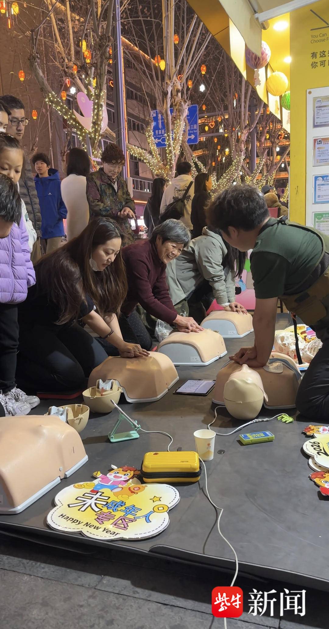一组学员学习时间在25分钟左右,一轮结束,下一组紧接着上场。李春亮同样用游戏PK的方式,寓教于乐中传授技能。周五到周日的每天下午,流水席式的急救培训摊点一出就是三小时,哪怕只有一位路人愿意蹲下身练习,李春亮依旧会陪伴指导。李春亮表示,春节期间密集授课,腰都吃不消了,长时间跪地,腿到了晚上特别凉。“即便如此,在被需要中,我感到非常幸福。”