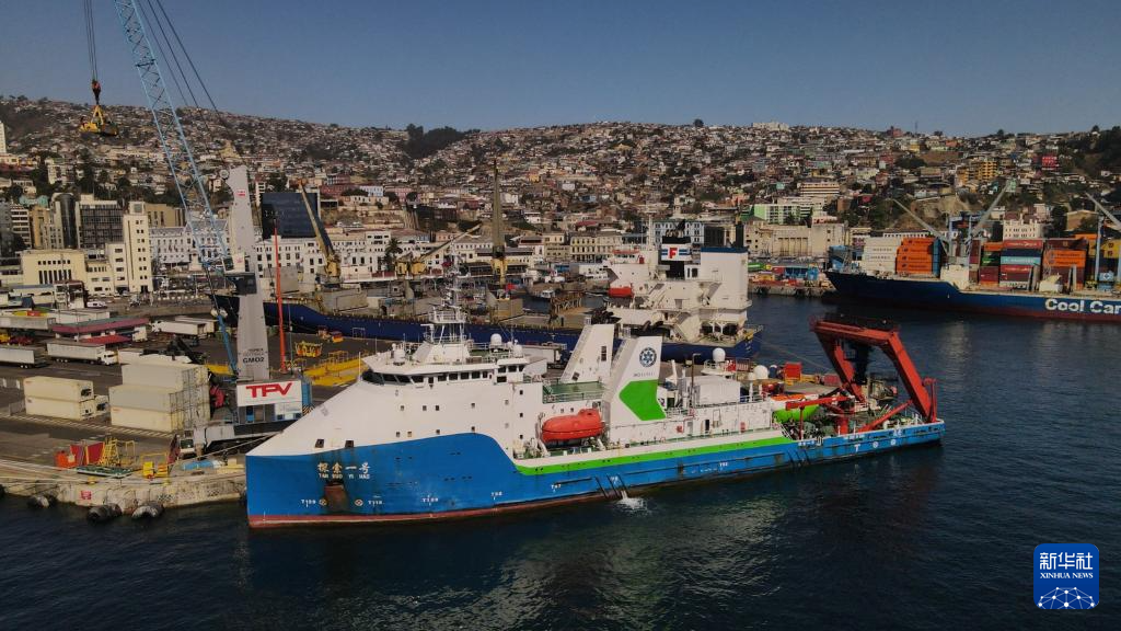 这是3月5日拍摄的停靠于智利瓦尔帕莱索的中国“探索一号”科考船(无人机照片)。