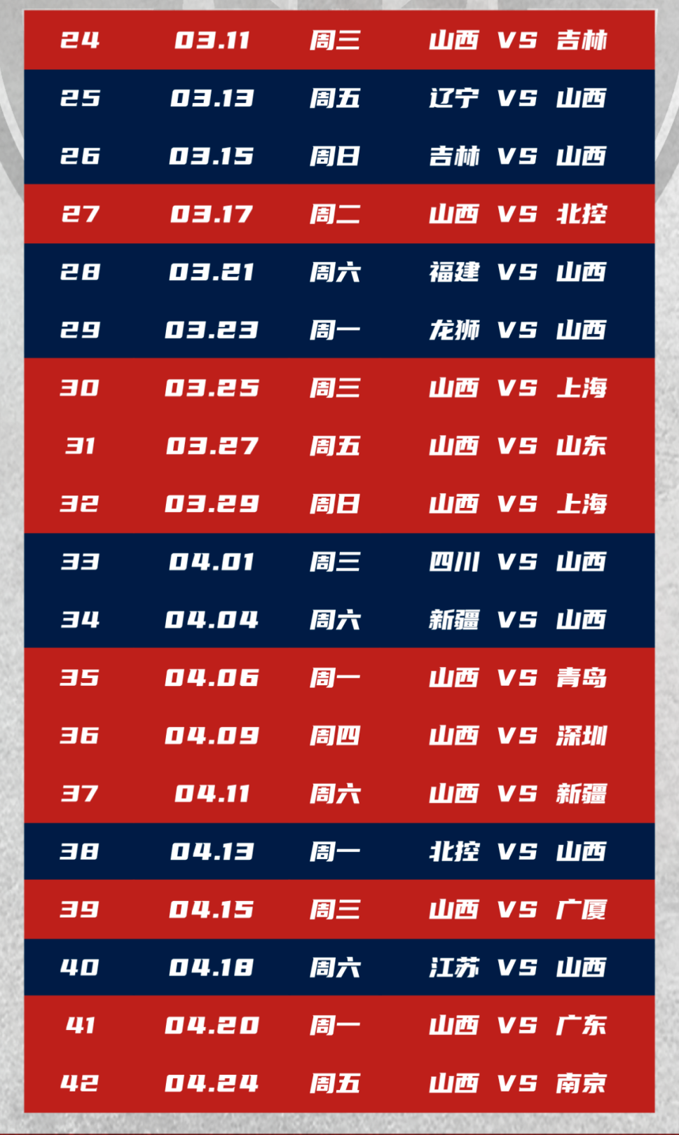 ▲山西男篮常规赛第二阶段赛程表,红色标记的场次为主场作战
