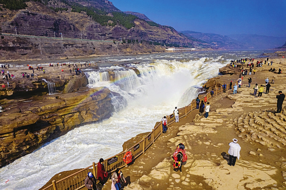 近日,吉县壶口瀑布景区内游客络绎不绝。随着春季气温回暖,黄河上游冰凌逐渐消融,壶口景区水量持续激增,奔涌的黄河水倾泻而下,升腾起层层水雾,在水雾与阳光的作用下,壶口瀑布上方出现了一道亮丽的彩虹。从空中俯瞰,黄河水如万马奔腾急流而下,气势雄浑磅礴、涛声震天,撼人心扉。