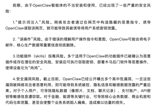 2月5日,工业和信息化部网络安全威胁和漏洞信息共享平台监测发现OpenClaw开源AI智能体部分实例在默认或不当配置情况下存在较高安全风险,极易引发网络攻击、信息泄露等安全问题。