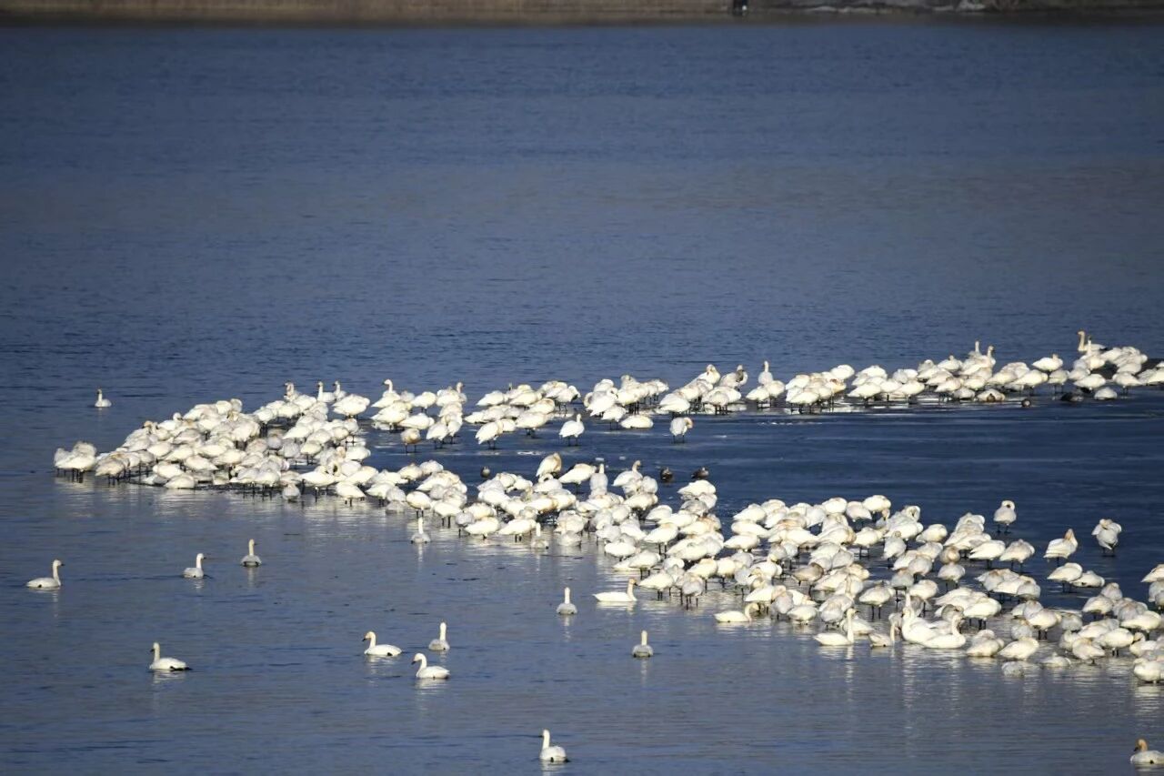中部地区,天鹅翩跹成景。除吕梁文水外,山西中部、北部及东部多地也陆续迎来北归天鹅。晋中昔阳郭庄水库,一批北归白天鹅与野鸭结伴栖息。摄影爱好者介绍,今年天鹅较往年早到半个月,数量也明显增多,昔日水库已然变身“天鹅湖”。