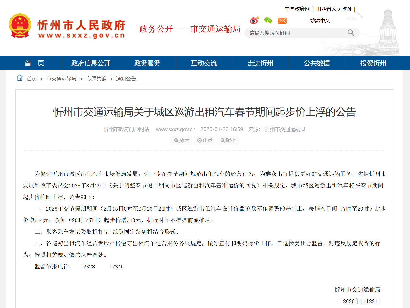 春节期间,忻州城区巡游出租车起步价临时上浮