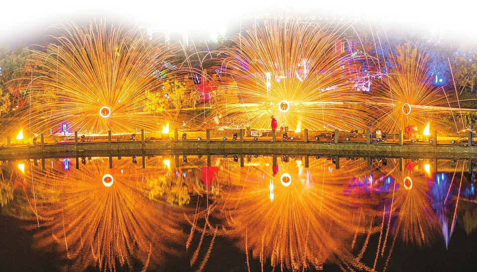 10月2日,运城市盐湖景区推出的打铁花表演震撼人心。薛俊摄