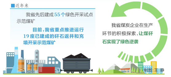 近年来,我省煤炭企业在煤矸石源头减量、过程防控、末端治理等方面进行有益尝试,持续提升煤矸石资源化综合利用水平,将其作为实现煤炭产业绿色低碳转型的关键环节,压实主体责任,加大创新力度,落实地方标准《煤炭绿色开采技术指南》,先后建成55个绿色开采试点示范煤矿,基本形成充填开采等绿色开采体系,实现经济效益、社会效益、生态效益共赢。目前,我省重点推进运行19座已建成的矸石返井和充填开采示范煤矿。