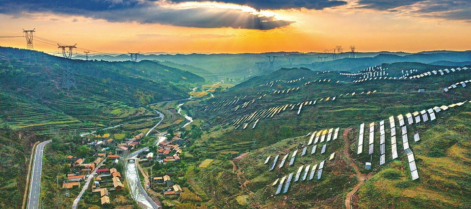 10月15日,夕阳西下,左权县高马沟前上峧光伏电站闪耀的光伏板融入太行山区观光旅游风景线。近年来,左权县在荒山荒坡发展光伏发电项目,将荒山变“金山”。