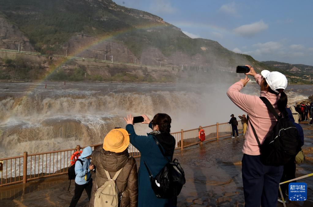 10月27日,游客在山西吉县黄河壶口瀑布景区欣赏“彩虹桥”景观。