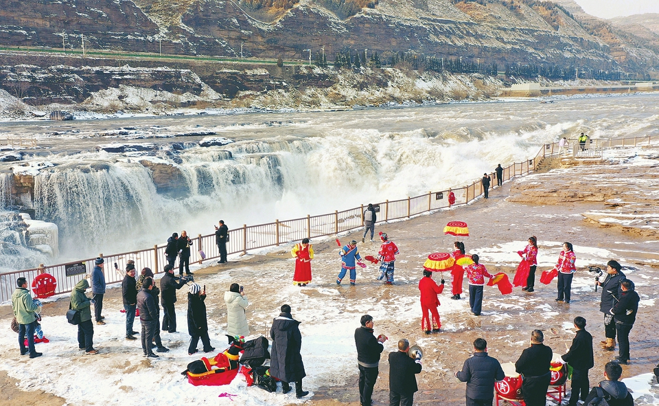 图①1月1日,吉县黄河壶口瀑布景区,奔腾的黄河水与瀑布两岸山坡的白雪相映成趣,吸引游客拍照留影。吕桂明摄
