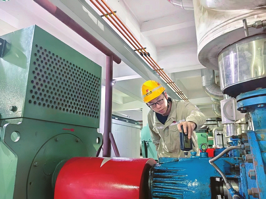 太原市第二热力有限责任公司工作人员手持仪器对供热设备进行巡检。