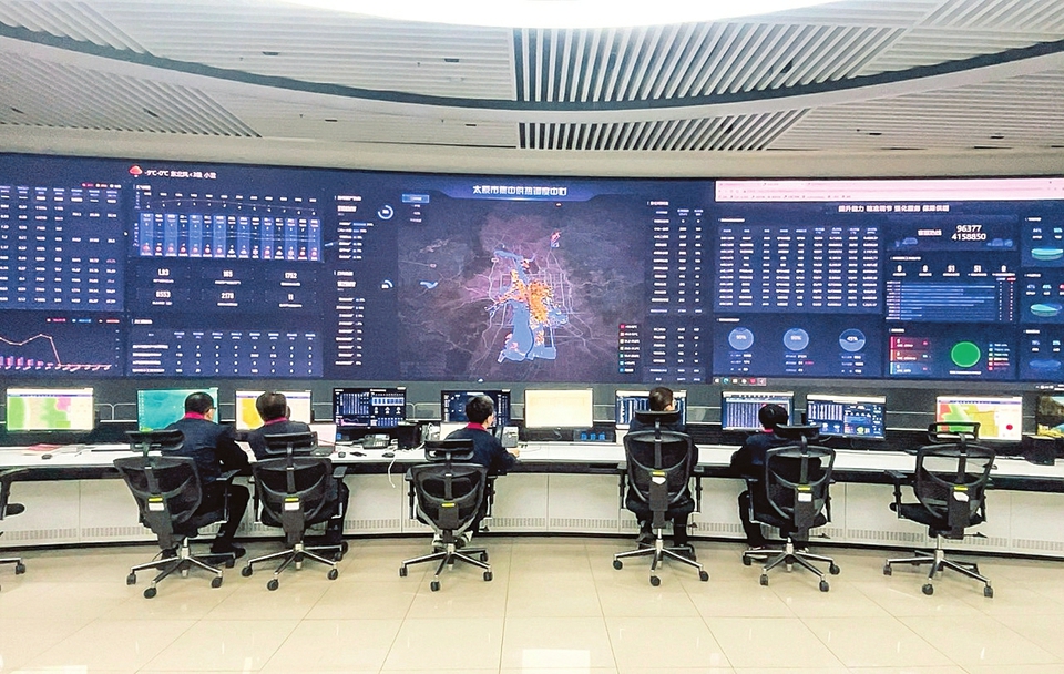 太原市集中供热调度中心巨幅电子屏幕上,各处供热站的供回水温度、流量等关键运行参数一目了然。