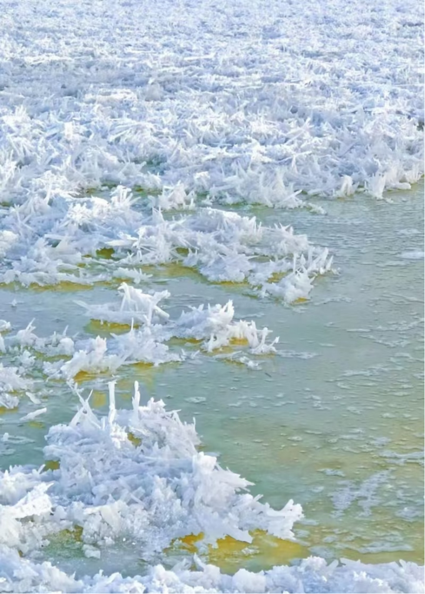 放眼望去,形态各异、晶莹剔透的晶体在湖岸盐板上绵延生长,在阳光下犹如钻石闪耀。这并非每年都能邂逅的景象,只有当气温持续低于零下5摄氏度时,这份大自然的馈赠才会如约而至。