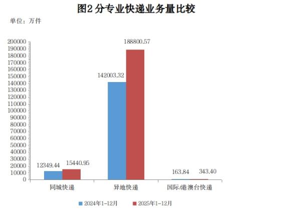 作为寄递业务的核心板块,快递业务表现同样抢眼:全年快递业务量完成20.46亿件,同比增长32.40%;邮政行业业务收入(不含邮政储蓄银行直接营业收入)累计达210.15亿元,同比增长13.45%,其中快递业务收入增至153.24亿元,成为支撑流通与消费的重要“大动脉”。
