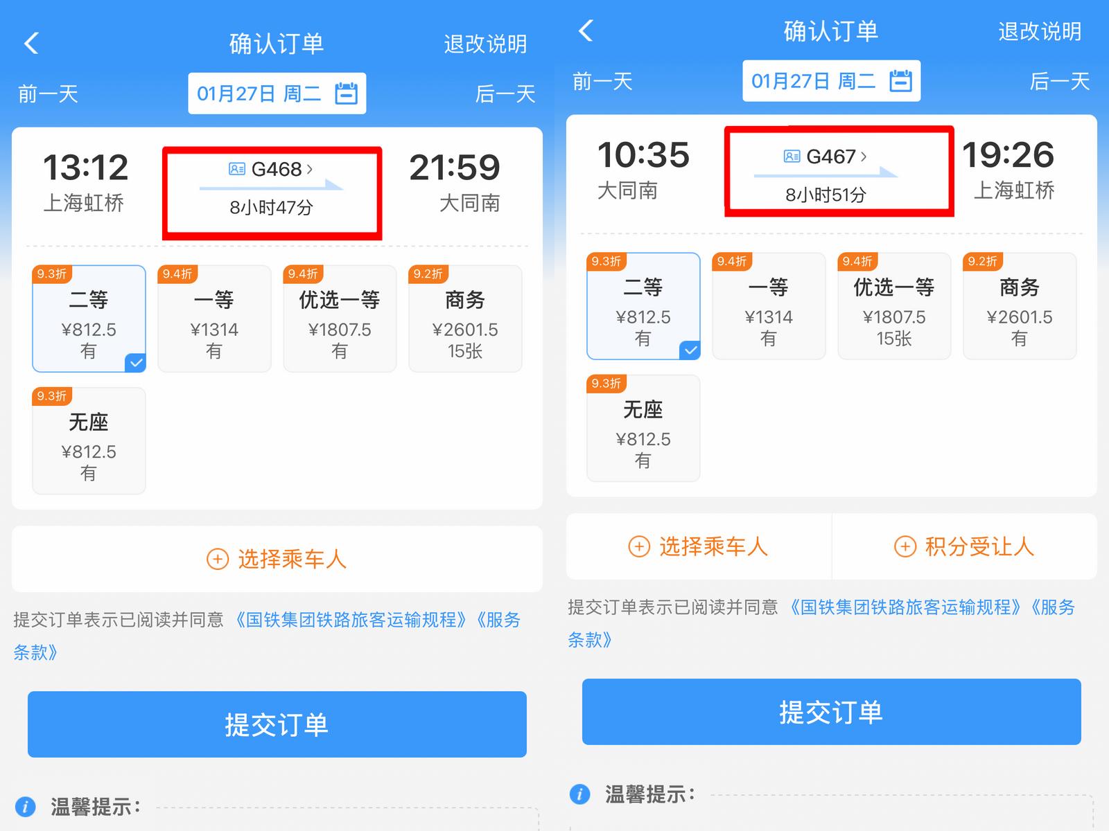 大同南至上海虹桥G467/G468次标杆列车升级,是本次调图最受关注的亮点。所谓标杆高铁列车,是指运行速度快、停靠站点少的精品列车,通过精简中途停站压缩运行时间,最大化提升跨区域出行效率。