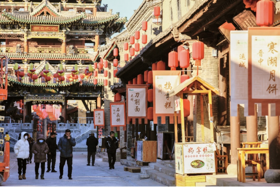 与此同时,一场小型的非遗年俗市集同步展开。本地特色年货、剪纸、花馍等手工艺展示摊位,让游客在感受视觉震撼之余,还能亲自体验,将一份“看得见、摸得着”的山西年味带回家。冰山、暖粥与市集,共同构成了一个动静结合、古今对话的立体节庆空间。