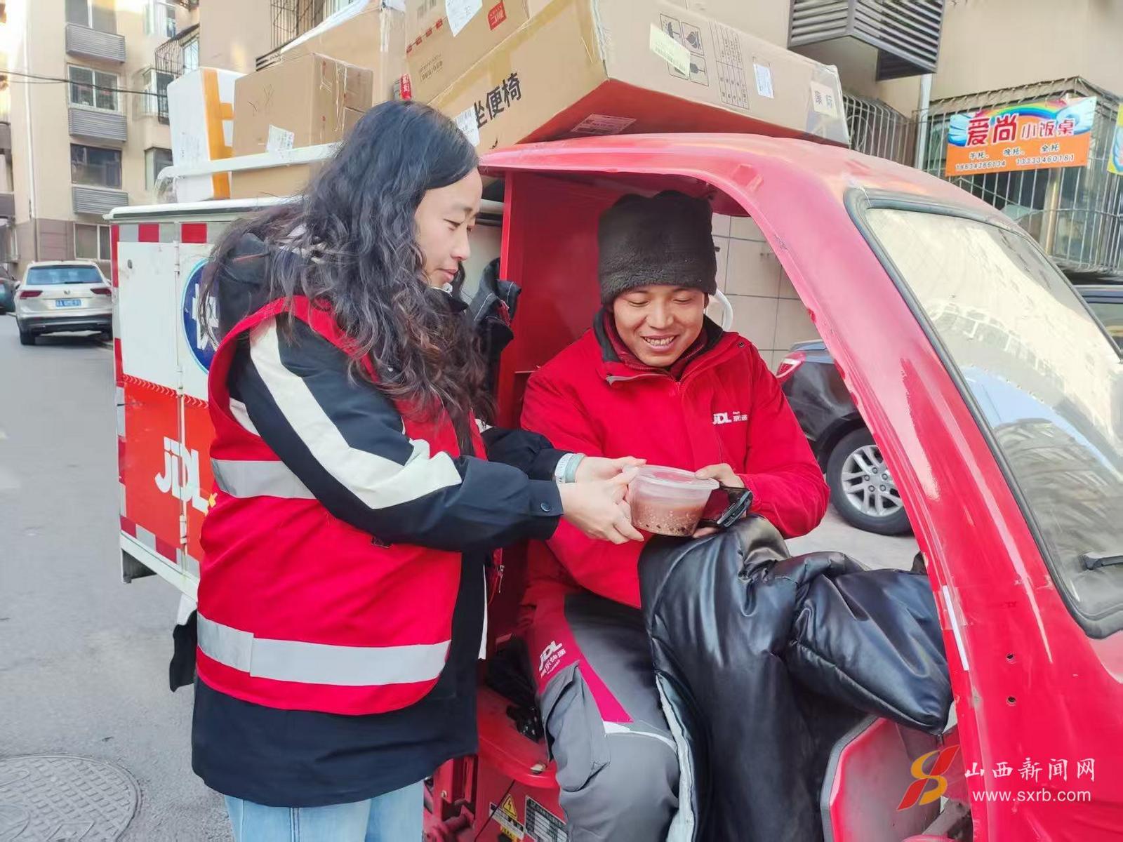腊八节当日,太原市小店区中辐院社区则聚焦于对特殊群体的关怀与慰问,开展了“情暖腊八节 关爱暖人心”慰问活动。社区工作人员早早熬制好香甜软糯的腊八粥,分发给清晨辛勤工作的环卫工人和穿梭奔忙的快递员,感谢他们为社区整洁与便利付出的辛劳,并叮嘱大家注意防寒保暖。