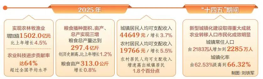 2025年,我省粮食播种面积、亩产、总产实现三增。全省粮食总产量达到297.4亿斤,创历史新高,比上年增长1.2%;粮食亩产313.0公斤,增长0.8%。全省肉、蛋、果、菜等重要农产品产量全面增长。供给充裕的背后是生产、加工、销售各环节协同性的提升。新发展的13.1万亩设施农业,不仅保障了城乡居民的“菜篮子”,也为观光采摘、农事体验提供了载体。