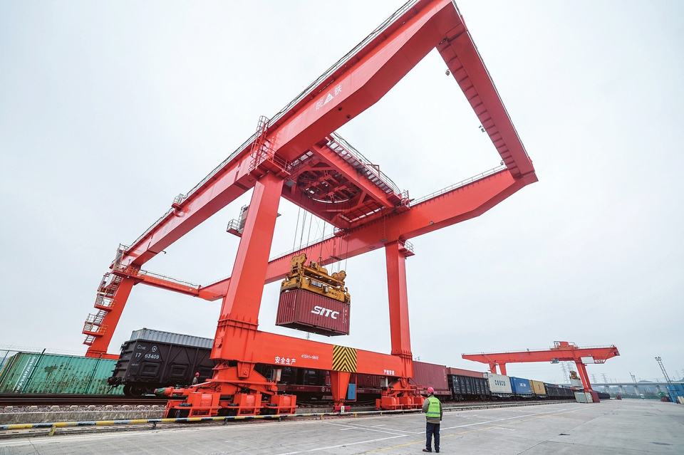 1月30日,在义乌铁路口岸,一列载着红酒、葵花籽油、气泡水等进口商品的中欧班列回程班列在卸货。春节临近,在全球最大小商品集散中心浙江义乌,一列列自欧洲归来的中欧班列,正将西班牙的红酒、葵花籽油和气泡水以及波兰的牛奶、法国的红酒等“洋年货”准时送抵义乌,堪称“移动的欧洲年货集市”。
